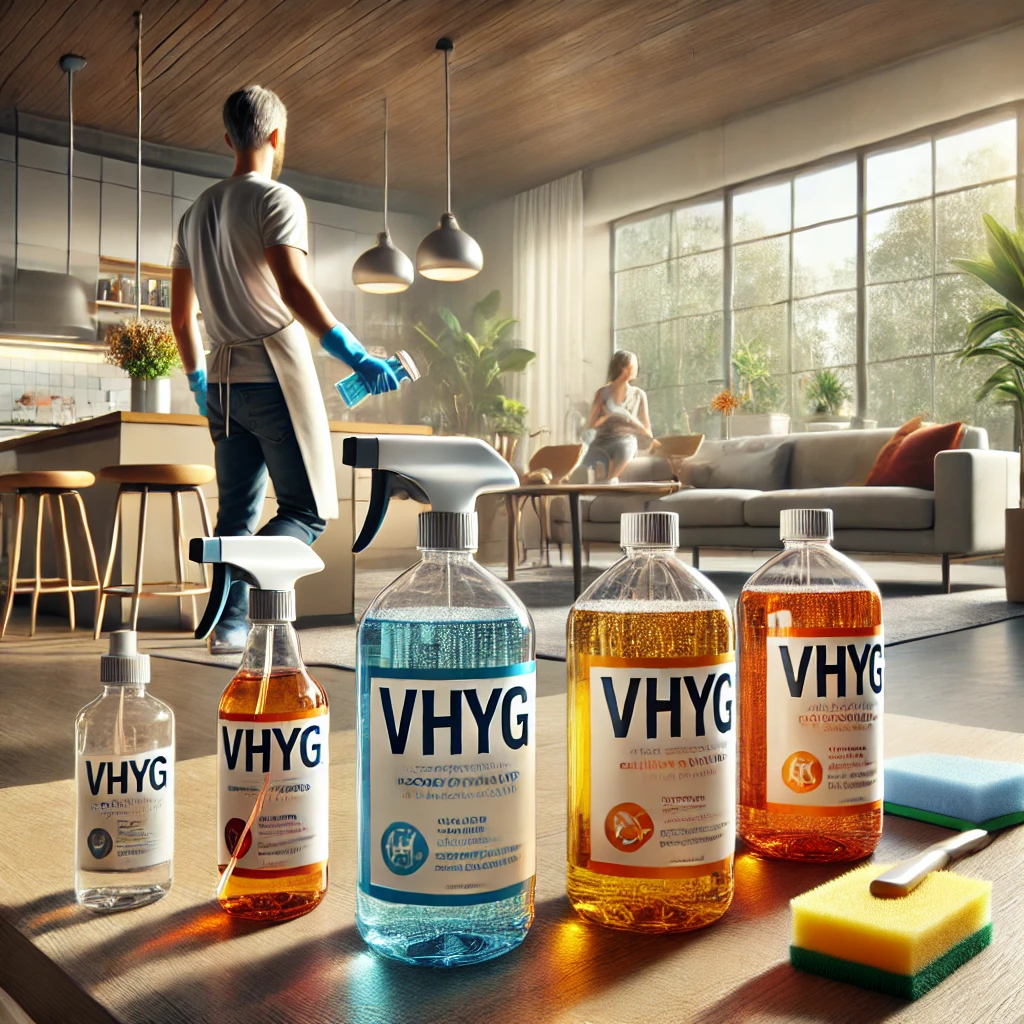 Un membre de la famille utilise les produits VHYG pour nettoyer la maison, illustrant l’impact positif sur l’hygiène domestique. Les flacons VHYG, facilement reconnaissables, sont au cœur de l’action, reflétant leur rôle essentiel dans le maintien d’un environnement propre et sain.
