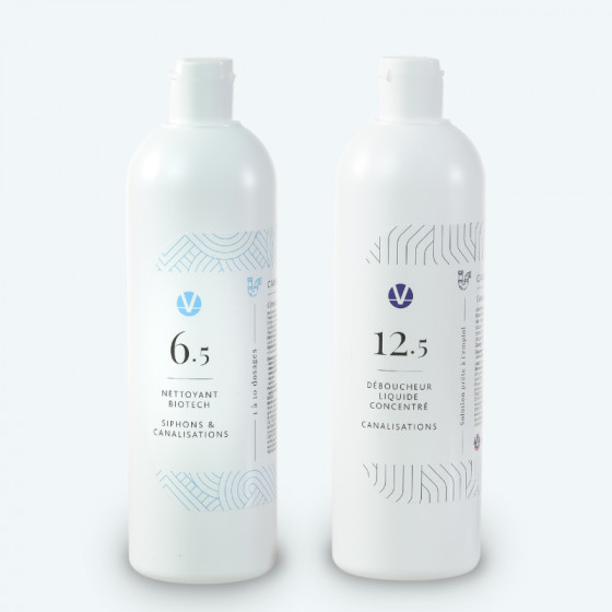 Optimisez l’entretien de vos canalisations grâce à notre Déboucheur et Nettoyant siphons conçu pour les siphons et les canalisations. Ce pack contient un produit curatif ultra puissant pour éliminer les matières organiques et un produit préventif pour un entretien quotidien efficace. Sans danger pour vos canalisations et fosses sceptiques, il comprend le 12.5 Déboucheur liquide concentré canalisations et le 6.5 Nettoyant biotech siphons et canalisations. Garantissez un fonctionnement optimal de vos installations avec ce pack complet.